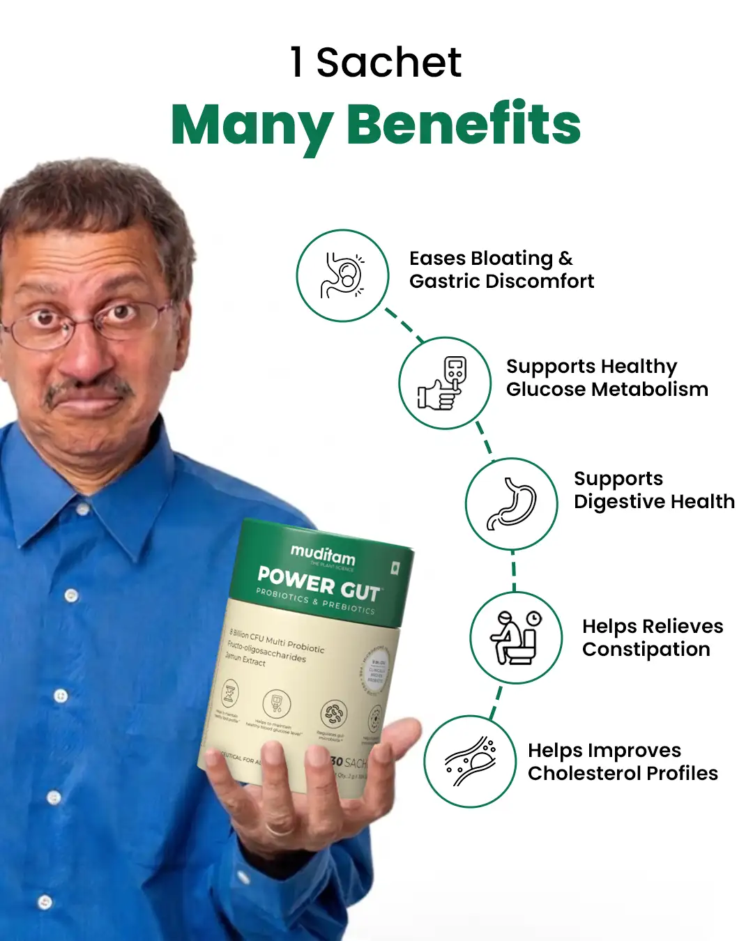 A balanced blend of proven pre-probiotics and Ayurvedic herbs designed to support digestion, reduce bloating, and promote overall gut wellness.