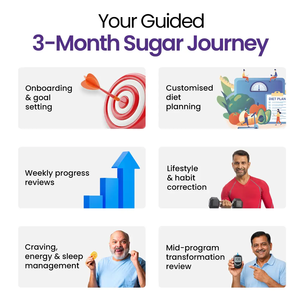 One-on-one expert guidance through 12 consultations over 3 months for personalised sugar management.
